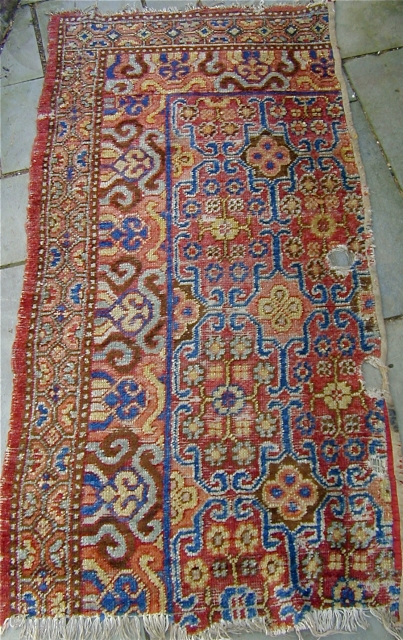 Two fragments from an 18th. century Khotan main carpet: one fragment in good condition with high pile; another distressed. Each fragment measuring approximately 61'' x 32''. Beautiful luminescent wool with glorious old colors.