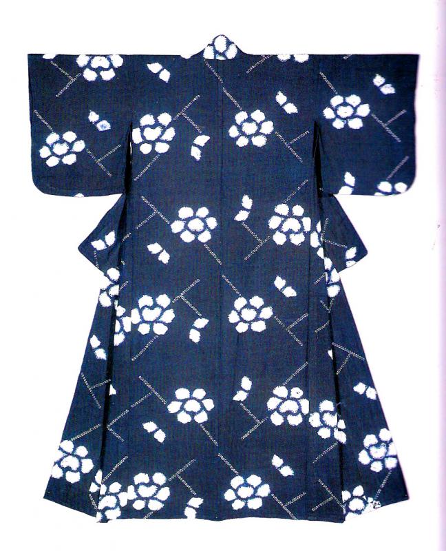yukata, Japan, Taisho (circa 1920), cm 147x120. Yukata are Japanese summer garments, usually made of cotton or hemp as lightweight as possible to allow transpiration during the hot and humid months in central and southern Japan. These informal kimonos also frequently worn after bathing at traditional Japanese inns, as ‘yukata’ literally means ‘bath(ing) cloth’. This one is a particularly nice example of a ‘country’ yukata with hand-spun and hand-woven cotton dyed in dark indigo, and decorated using the ‘shibori’ or shape resist technique. This piece has been published in a rather important exhibition catalogue; please enquire for full reference. Visually compelling and in very good condition.
