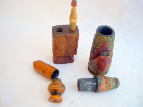 moroccan tuareg artifacts which are hand carved, hand painted, wooden pots for the storage of kohl, a cosmetic widely used for eyes. ... read more