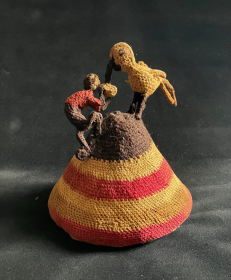 Unique and charming Pre-Columbian hat with three dimensional bird and monkey figures fighting for possession of a what appears to be a ... read more
