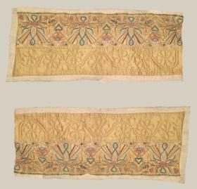 Florentine base of Tuscan promise, Italy 17th c (1600-1700) a pair of quilted, multicolored silk chain-stitch embroidery on golden yellow silk satin. ... read more