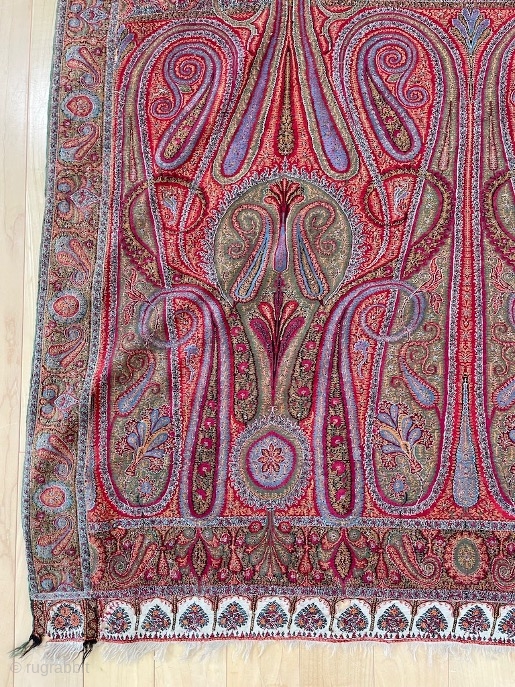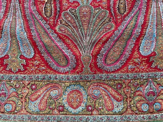 4’7” x 11’2” / 137cm x 480cm. Kashmir shawl, twill tapestry, pieced construction, embroidered lappets, good.