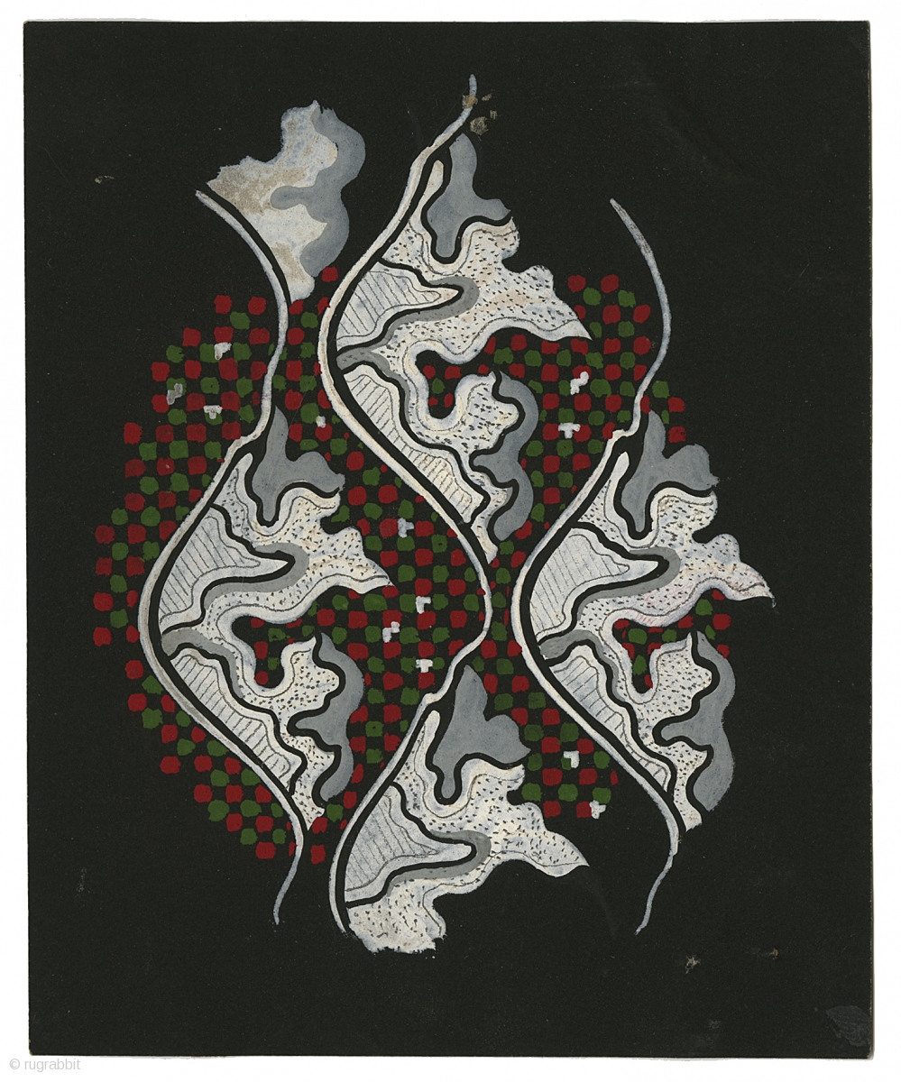Art Deco Textile Paintings. Germany, c.1920s-30s. Gouache on paper. These designs were intended for silk jacquard tie fabrics. The designs came from a large ledger - the tie company's record book. The sizes as shown are: #5 5" x 4"; #6 5" x 4"; #7 5.25" x 4"; #8 5.25" x 4". The fabric sample is an example of a silk jacquard tie fabric based on a design from this ledger (3.75" x 1.75"). The designs were usually painted in a larger scale than the actual finished fabric. Each painting is $25 - your choice.