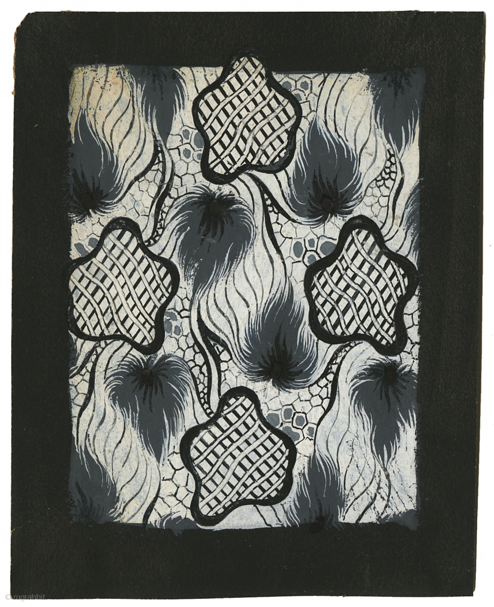 Art Deco Textile Paintings. Germany, c.1920s-30s. Gouache on paper. These designs were intended for silk jacquard tie fabrics. The designs came from a large ledger - the tie company's record book. The sizes as shown are: #1 4.5" x 4"; #2 5.5" x 3.75"; #3 5.25" x 4"; #4 5" x 3.25"; #5 5" x 4"; #6 5" x 4"; #7 4" x 4". #8 3.75" x 1.75" is an example of a silk jacquard tie fabric based on a design from this ledger. Each painting is $35 - your choice, or $175 for all seven paintings.