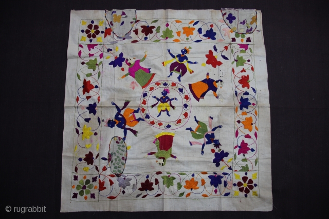 This Rumaal depicts Krishna a Raas-Leela with Gopis and floral patterns all over. The figures are particularly well defined here. There are three patches in the Rumaal that have been repaired with fragments of other Chamba Rumaals. This repair was present when the item came in my possession.