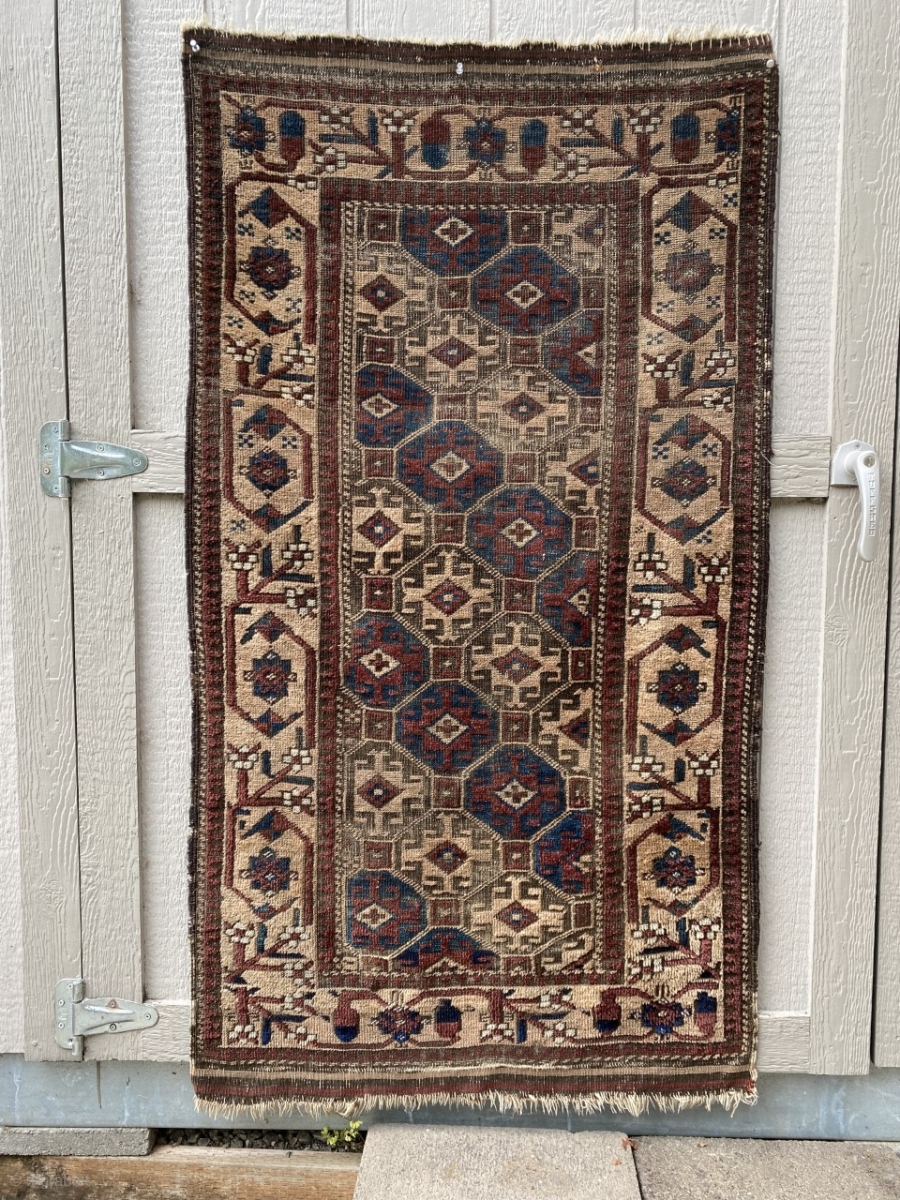 Circa 1900 Baluch camel hair rug, 2'10" x 5'4". Nicely drawn lattice field pattern with a clear blue in alternating diagonal bands. Areas of wear in the field (see photo). Original ends and side cords.