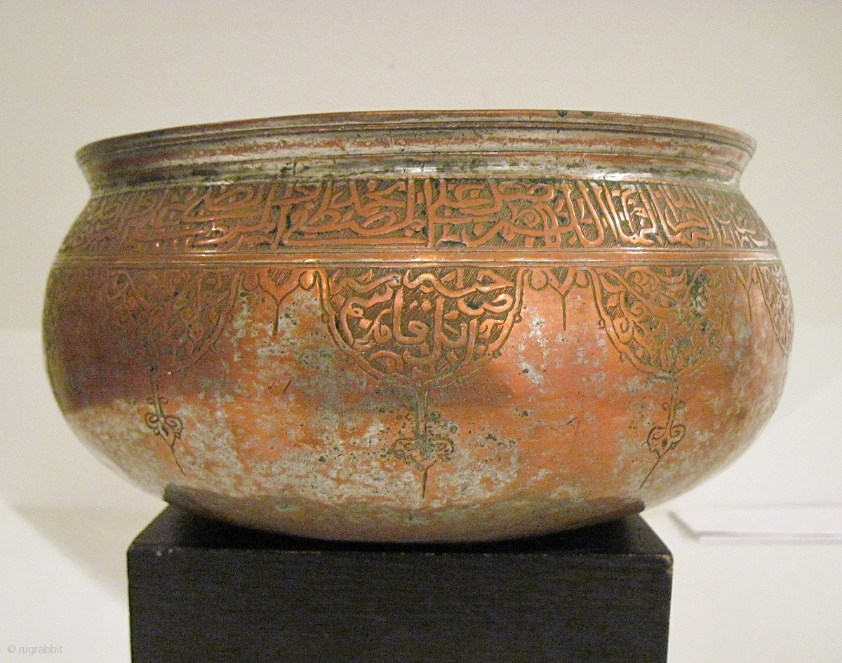 Large, early, tinned copper vessel, inscribed. Probably Central Asia, 16th/17th c. 11"d x 6"h. For a comparable example, see: Uzbekistan, Kalter & Pavaloi, pg. 120, fig 192.