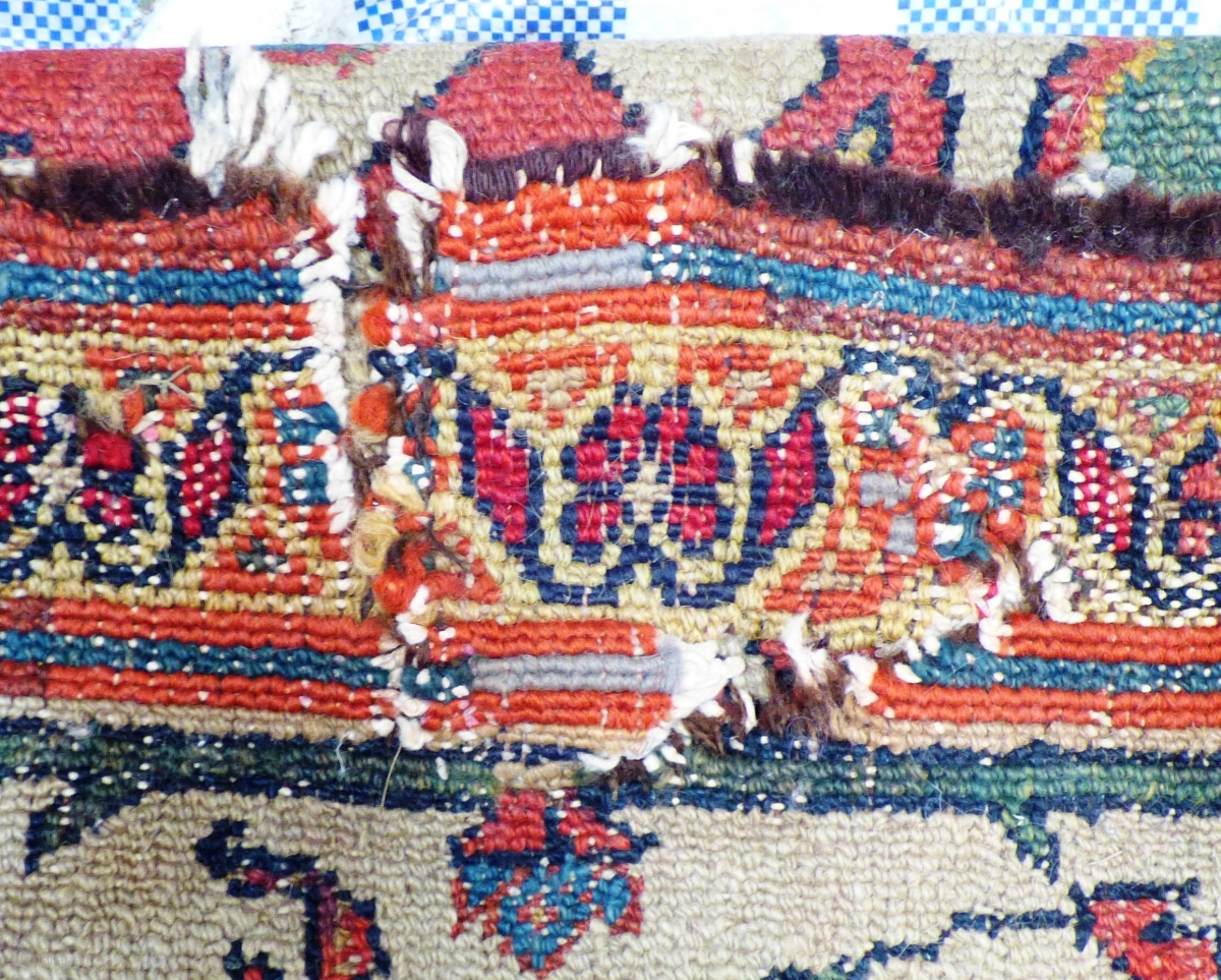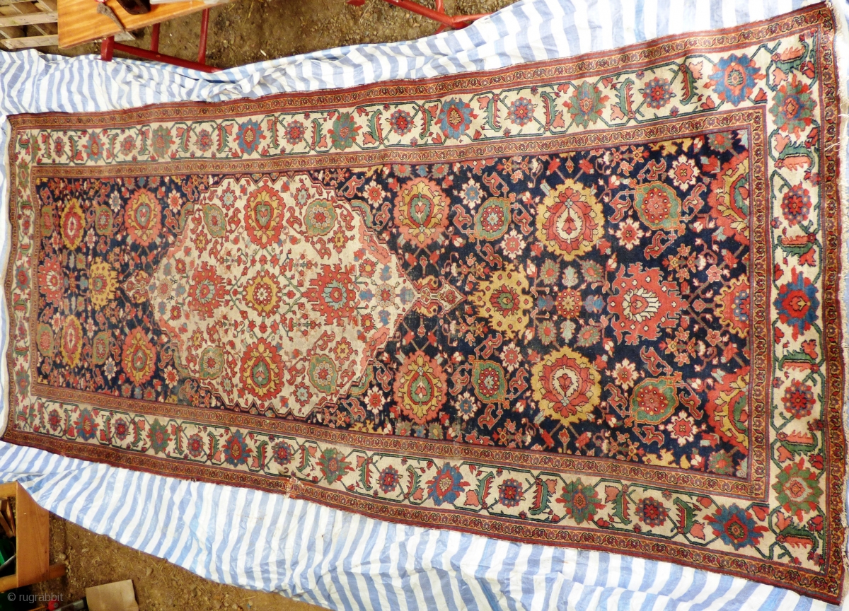 Large North West Persian ‘harshang’ Gallery Carpet with large central ivory medallion. Wool on Cotton warps and dark brown wool weft foundation. 19th Century. Size: 6'8" x 17' or 2.04m x 5.18m approx. One tear on edge. Pile low in places and foundation showing. Minor losses one end. Minor damage in places - see photos. Carpet has integrity, not fragile. No evidence of moth. Sides and ends original. Photos taken on uneven surface - carpet lies flat on level surface. Last 5 photos show damage, restoration or back of carpet. Please ask for more photos if required.