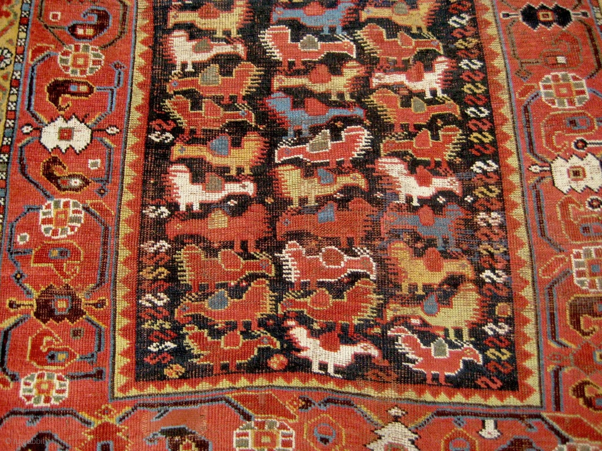 Long Khamseh 'chicken' rug; some condition issues, but dramatic and striking. Priced accordingly.