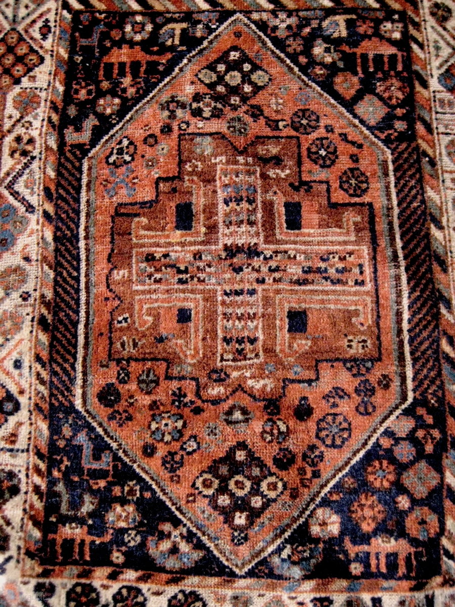 Small South Persian rug, probably Khamseh, with many intriguing features, including camels and a very attractive border. End losses and some ground showing, but overall in good condition. 1.40 x 1.08 m.