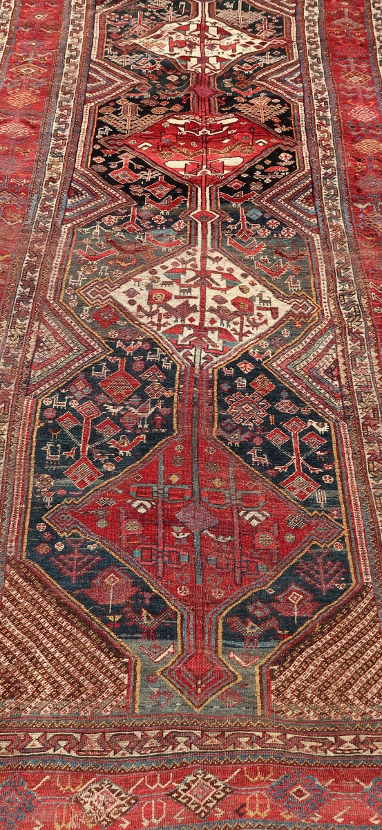South Persian Tribal, the main field and border filled with dogs, goats ,and chickens and some people . wool on wool. around 1900 .Cleaned and washed, good colors. ca. 160 x 330 cm. Some wear .