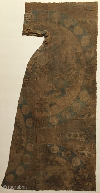 Tang Dynasty silk fragment with a large composite dragon in a pearl roundel. Central China, 8th century. An unusually rendered dragon perhaps based on Sasanian Persian or Sogdian prototypes?