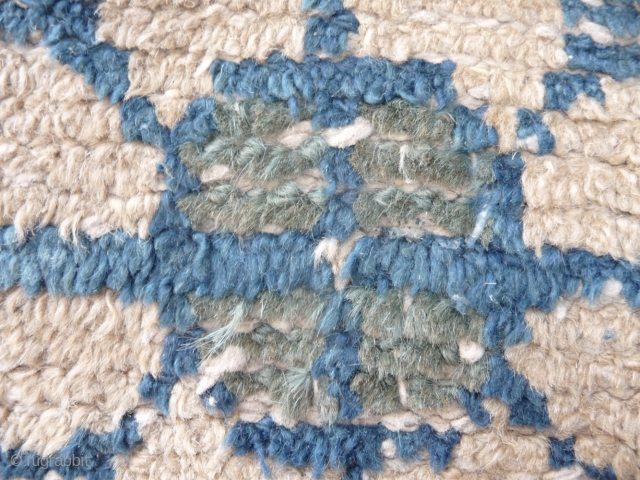 this an early chinese rug in fragmentary condition but this is not a fragment of bigger rug as is is attested by the original ends and selvedge. the fact that it looks like the quarter of a rug doesn t mean that it is a part of a carpet made originally in 4 pieces.and as we know oversize pieces from early time, there were no reason to do like this. it has been most probably made in this shape to fit a special place in a nobel house or palace. the bold lotos border is similar to other known early pieces, like the drawing of the clouds too. wide weft system and long pile, originally a rather thick carpet. the right half has still good pile. 200x 200cm. around 1700 or before.