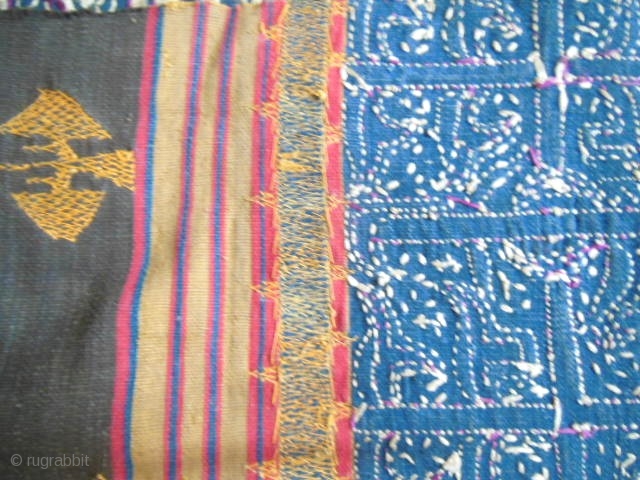 Lampung ceremonial cloth from Indonesia, South Sumatra 19c .Woven striped background cotton in shades of red madder, indigo, yellow and brown. Red and white silk embroideries with geometric patterns on indigo background. Strips of gold brocaded and embroidered geometric figures also. Good condition.