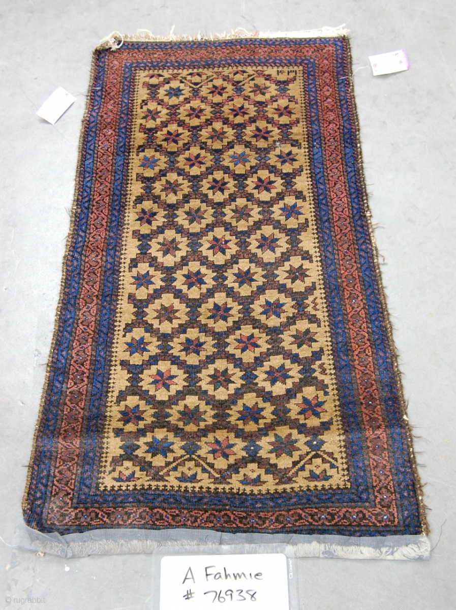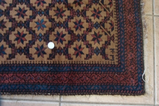 a Camel Hair Arab Baluch Dated about 1890. The date is in the top right-hand corner of the field. Besides all the glorious colors if you enlarge the main picture you will see some great greens and electric blue. The detailed photo is of a tiny hole. It has been professionally cleaned by the Mann. It is aprox. 3ft x 6ft. The detailed photo of the date and the last two pictures were taken before i had it cleaned.