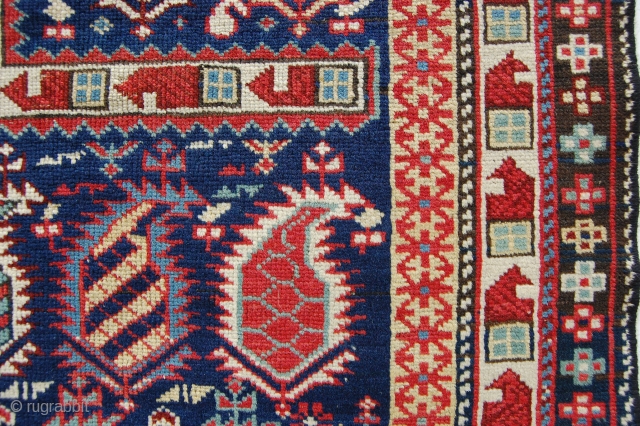Decent condition with some localized wear in the field. Original ends with kelim, sides cut and missing 1-2 knot rows - overcast with blue wool yarn - no reweaves or re-knots. Good color and in the overall a good mid quality example of type.
