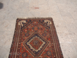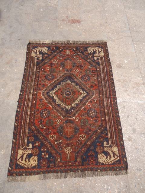 Qashqai or Shiraz Rug with four Lions each or every corner,all original without any repair or work done.Beautiful rug but worn.All natural colors.Size 4'5"*3'1".E.mail for more info and pics.