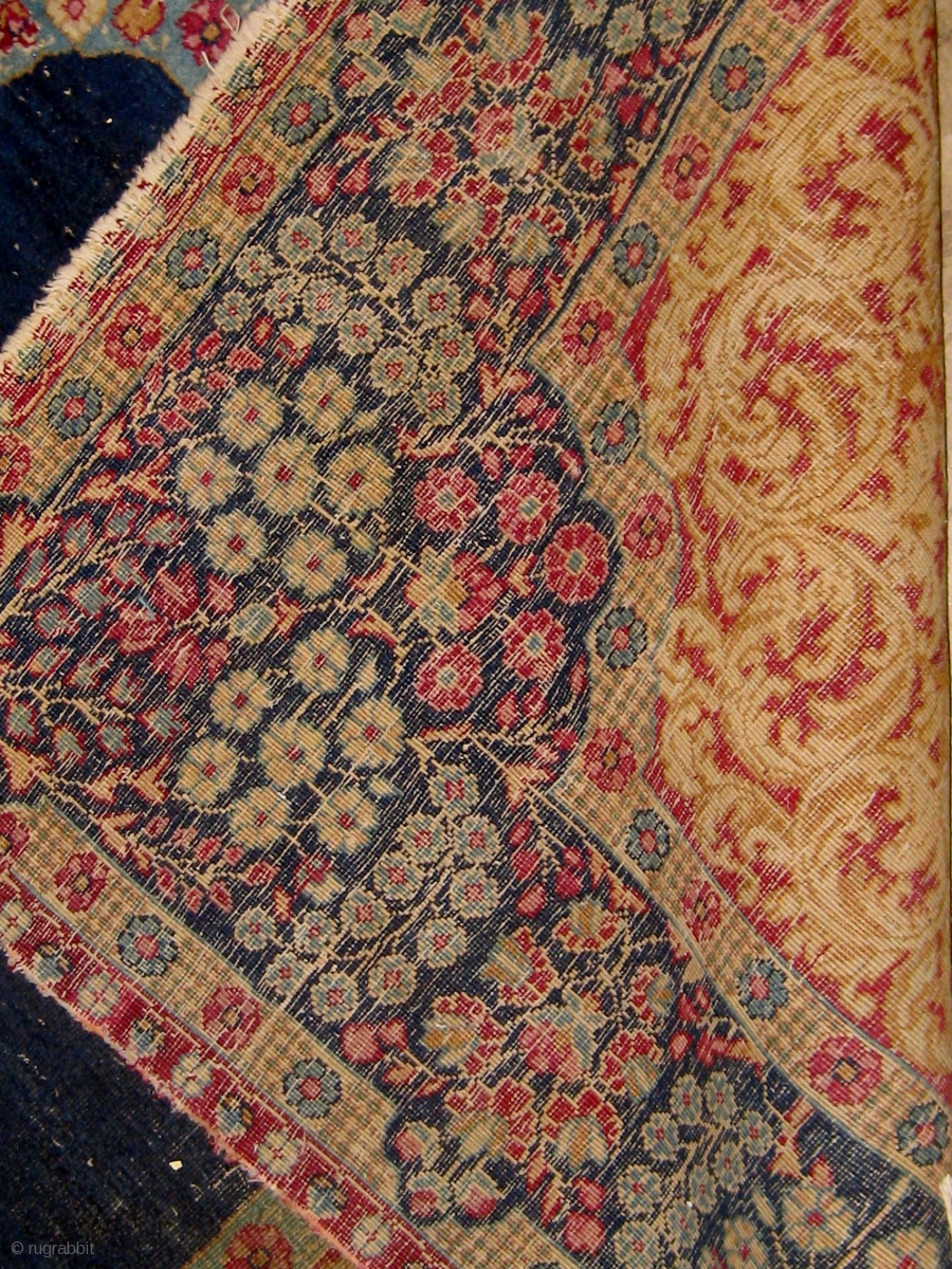 Antique Persian Kerman (circa 1910), open blue field with medallion, finely knotted, 3' 10" by 7' 4". Some wear, in need of a good bath. Please ask for additional photos.