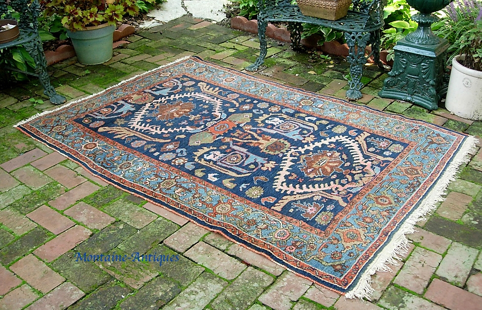 West Persian Tribal rug 4 ft 2 inches x 6 ft 0 inches. Can anyone identify this strange smiling animal? Looks like maybe a cat with a bird sitting on his shoulder?? Terrific colors. Pile gets a little bit lowish on one end but generally pretty good condition. Relatively thick, heavy weave. $25 For us shipping.