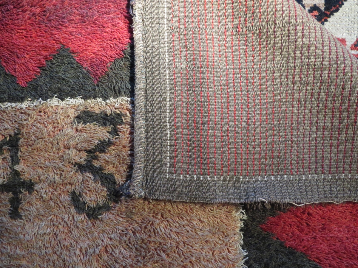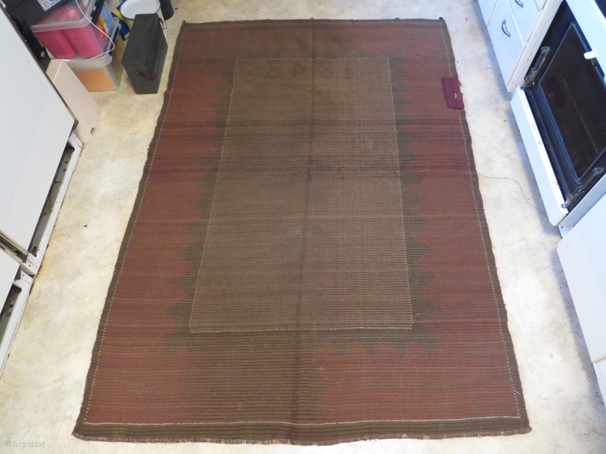 Finnish ryijy rug dated 1843, 189x130 cm. Good condition for age, it has very little wear and some spots, both in the field and the red border. Rug is washed but could need another one. Cute repair on the back.