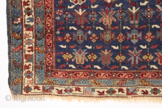 antique caucasian seichour kuba rug. Beautiful example of this attractive type with all deeply saturated natural colors. Good pinks, good greens and golds on a pretty medium blue ground. Good even pile with the heavy brown oxidation we like to see. Recent wash. Good age, ca. 1875 or earlier. 3'6" x 4'11"