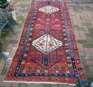 Northwest Runner-- 3 ft 10 inches x 10 ft 3 inches. Bright, lively, charming tribal piece with little smiling people and animals along one side. Great colors and ivory medallions. Note the crease along one edge. Easy repair because it has nice thick pile overall. a few ripples along the edges. It is cotton foundation so it can be blocked but it really lies pretty well just as it is if you use a pad. Approx $25 For us shipping.