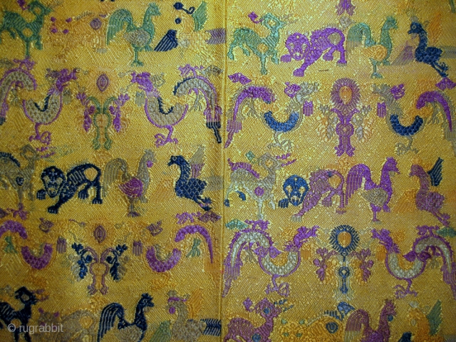 a rare antique Chinese silk woven textile hanging with the chinese zodiac animal motif. The piece dates to the late 19th century and is an exceptional beauty. The design consists of animals (dragon, monkey, cock, snake, etc) reflecting the Chinese zodiac years. It is made in a very unique weaving technique that incorporates double weave, hence creating the surface pattern. The yellow ground contrasts beautifully with the colourful animals. Some suggests these were wrapping cloths, but they were probably used as protective textiles for new born. Offered at a reasonable price. Email me your questions. size: 115cm x 77cm (45" x 30")