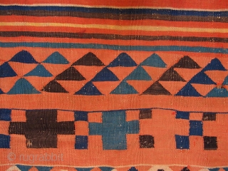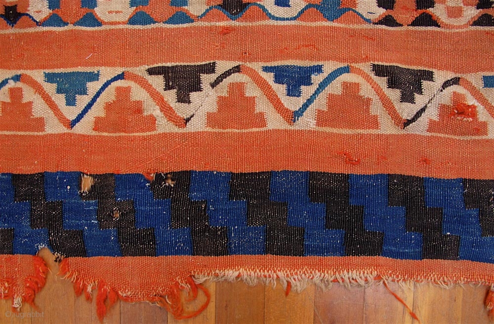 Old Gafsa Tunisian kilim. Nearly square—86 inches long and 87 inches wide (219 x 221 cm). Some fraying and notches at the ends, and some small holes, due mainly to the corrosive black/dark brown dye. Mostly interlocking tapestry weave, but also has some eccentric wefting where motif shapes are curvilinear. Colors are stable and appear to all be from vegetal dyes. Colors include a yellow that might not be obvious in the images. Of the few such kilims I’ve seen, i believe this one is the oldest, and I’d guess circa 1900, maybe older. At first glance, it is not obvious that the camel caravans crossing either end include red camels between the blue ones.