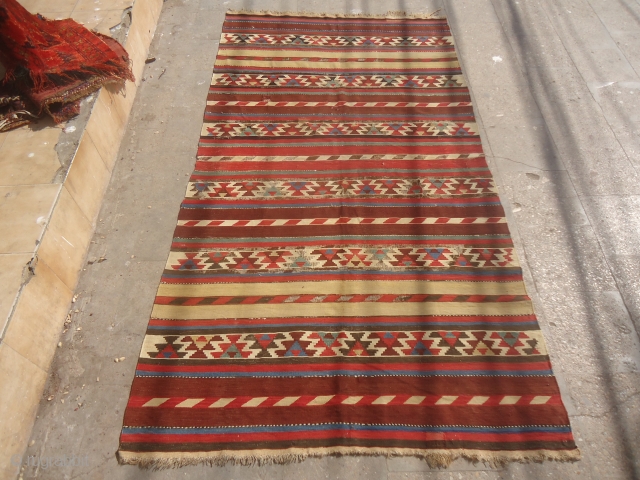 Shirvan Kilim with great natural colors and beautiful design,just oxidation to black,very fine weave and colors,good age.E.mail for more info and pics.