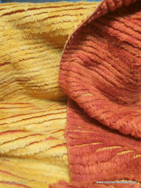 double sided moroccan berber middle atlas rug The technique of weaving double sided rugs almost always originates from the Beni M'guild Berber tribe. The rich lustrous tan colour of one side is offset by the deep butter yellow reverse side and makes a very attractive versatile rug which is in excellent condition. Reference 2570. Size 175 x 110cms. 5ft.9in. x 3ft.8in. Euros 720. sold. thank you.