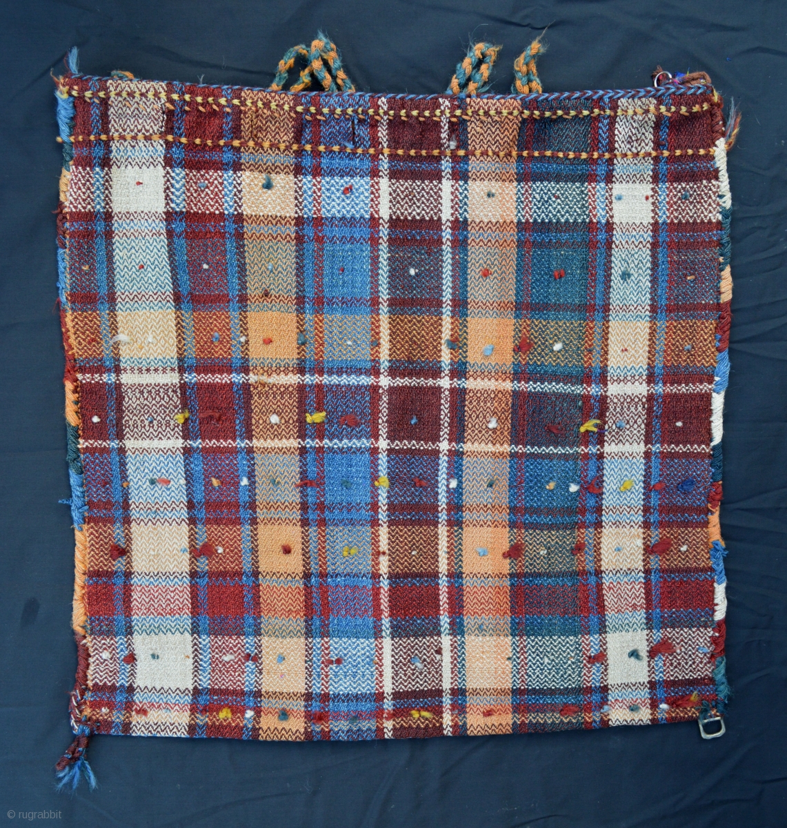 Qashqa'i small, complete storage bag - circa 1900 - woven in twill weave - like tartan! a really charming and unusual tribal bag. Images show front and back. 61cm (2') square.