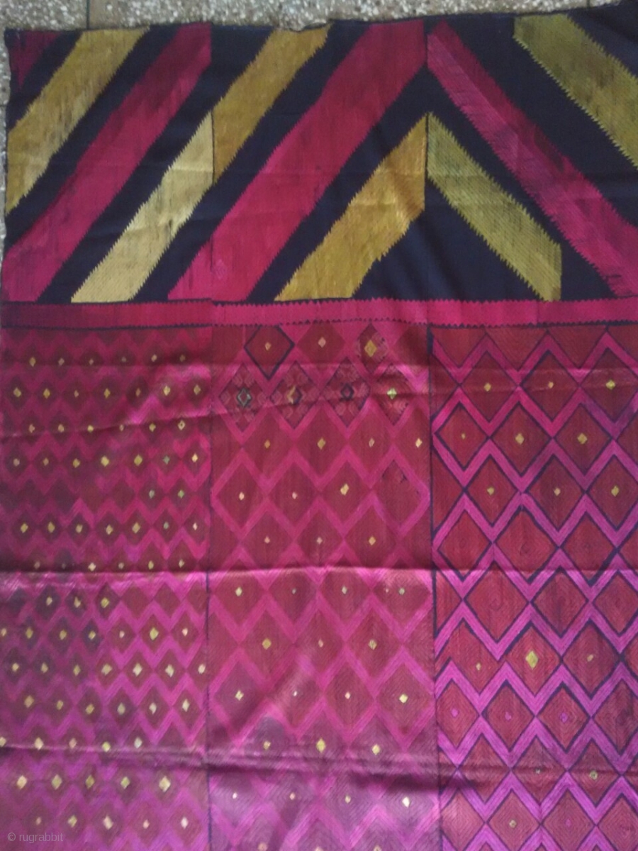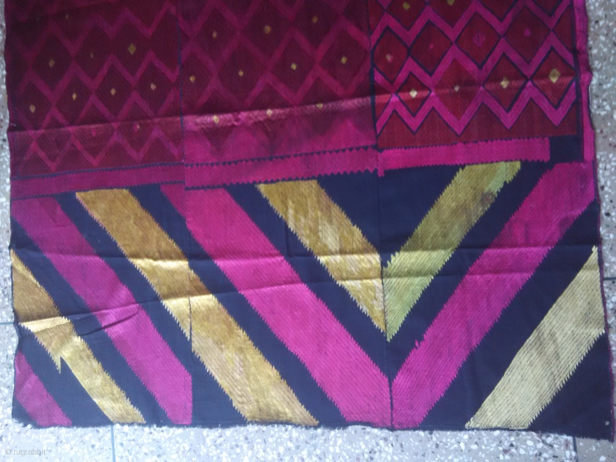 It's a rare black bagh(garden)from sindh Pakistan. It's in a very good condition and is atleast 90years old.generally these are red based bagh but very rarely we can find a black bagh.the picture does not justify with quality of the piece.the purple colour is also very rare and the suif embroidery is also very fine.its a collection piece for life time.