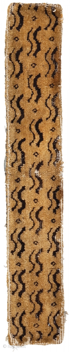 Notes: The weave and handle of this fragment is typical of the chunky carpets with square knots dated to the Ming period and attributed to the Imperial looms of Beijing (see for example 2-4 and 6). To my knowledge it is the oldest pile rug with the tiger (and leopard) pelt pattern. Also the treatment of the design is quite similar to the way it appears on Ming silk velvets. It was retrieved in Inner Mongolia.