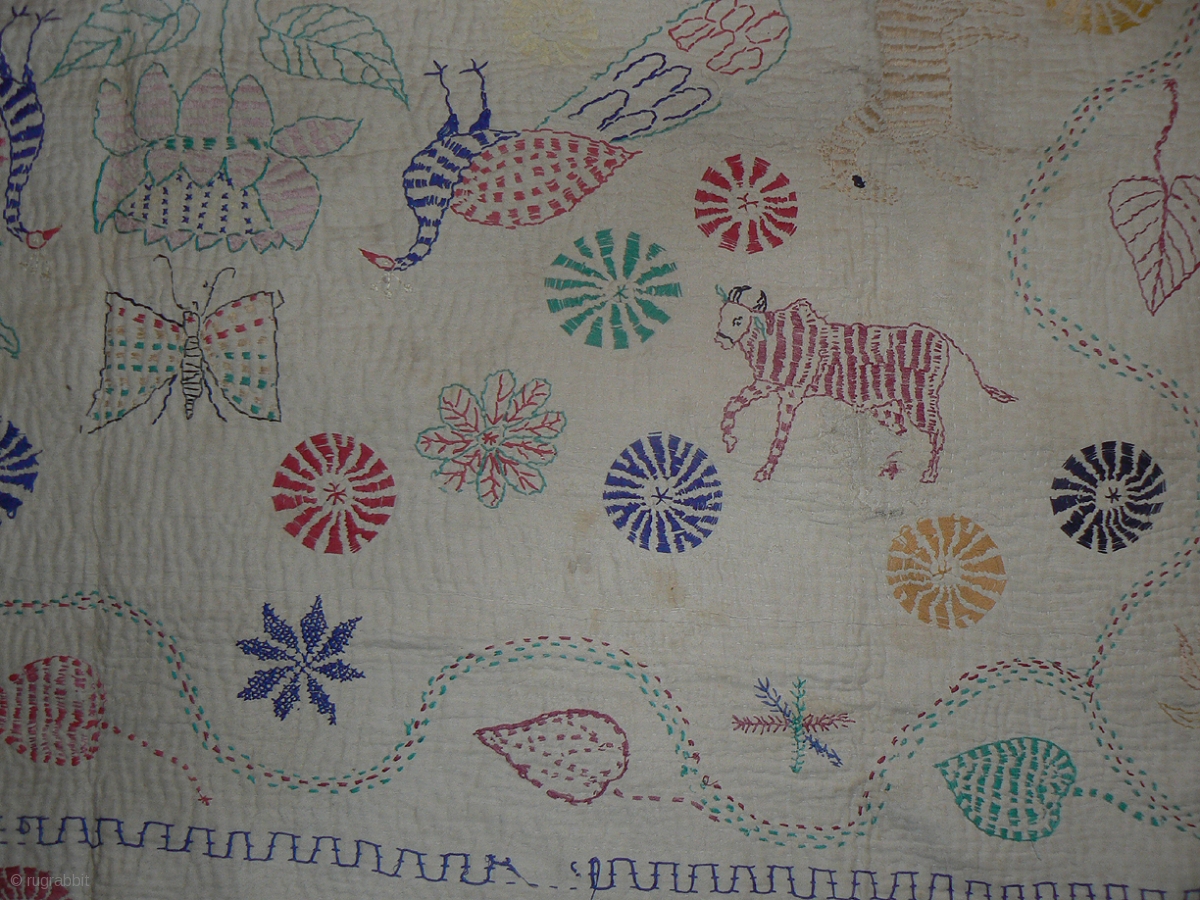 Antique Indian Kantha Embroidery Quilt. From the West Bengal region of India. 65 x 45 inches. This kantha has it all – horse and rider, butterfly, salamander, ox, peacock,flowers. Playful kinetic design. Quilting, running stitch throughout. Excellent condition. For all of the newly acquired kanthas, visit http://banjaratextiles.com/NewKanthas.htm