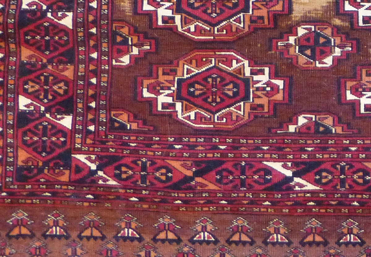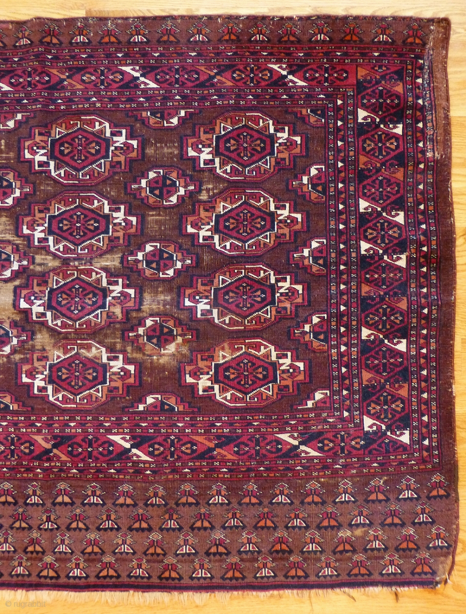 Fine Saryk Chuval. 45 x 36 inches. Beautiful colors. Obvious wear in the center. Floppy handle.
