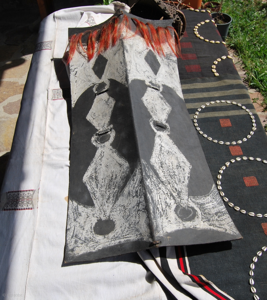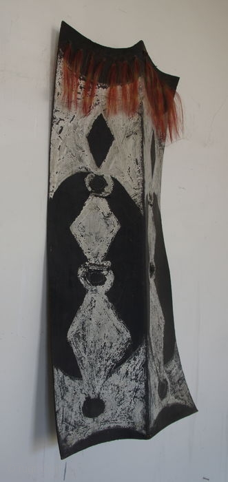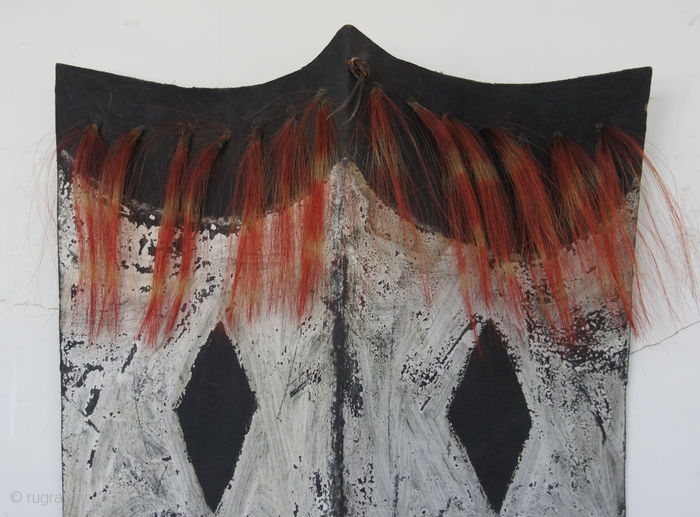 This is a Naga shield by the Konyak subtribe. It's a war dance shiedl. Cm 40x80 cm ca. Datable to the first quarter of the 20th century. This Konyak shield is made of buffalo (mithun) hide and decorated in white paint, the shield is held by a rattan strap in the back center.