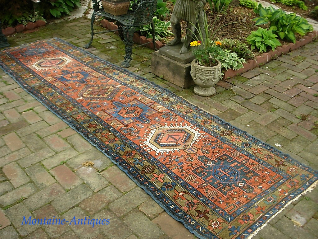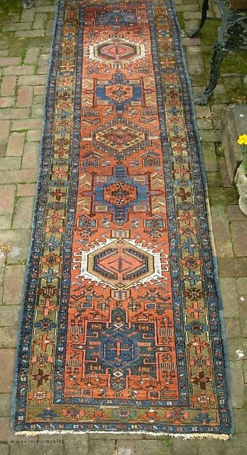 Karaja runner-- 2 ft 11 x 10 ft 4 inches. Nice old piece with soft colors. Pile is old but even with a smattering of foundation dots. $30 ups to Lower 48