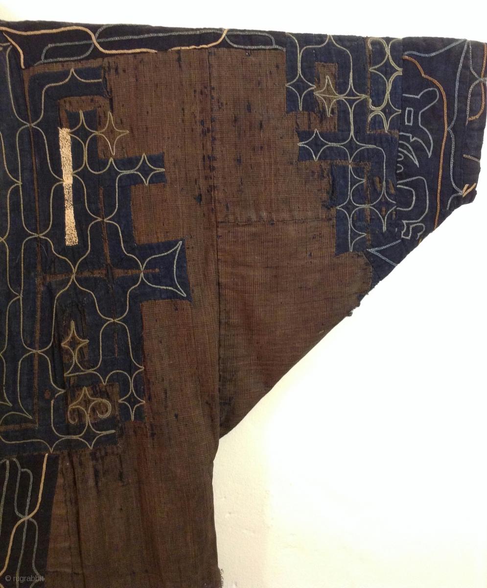 This robe was made by the indigenous people living on the northern most island of Japan. Both men and women wore these robes which are a form of appliche. the blue cotton or linen cloth is sewn on by hand with the white thread forming the design. the ground fabric seems like a handwoven cotton or linen. i am not sure. the robe has two repairs in front which are well done and blend in. The back is in perfect shape. Presently, the Ainu people are mostly integrated into the Japanese culture. THese robes are rare and i believe very beautiful and unique.
