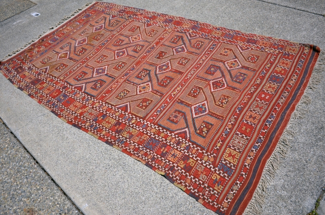 Very nice antique, i believe, Konya Region mixed technique/ kelim with embroidery. 5-5" x 8-7", Circa 1880. i am selling this for a client, it has been in the same collection for the past 25+ years. There are similar published examples. Great colors, nice purples, light blues and original braided end finishes are intact at both ends.