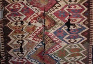 One of my finds from June spent traveling in Turkey, an early Karakelcili kilim with beautiful colours from natural dyes with a more varied palette than seen in most later kilims of the type. Unusual asymmetric rendition of classic Karakecili guls with cicim embroidered s hook and other motifs. In original condition, structurally sound with a square in the lower right panel cut out, holes, loss to borders and some corroded weft as visible in the photos. The kilim would benefit from being mounted on linen. Size 238cm x 150cm.