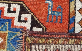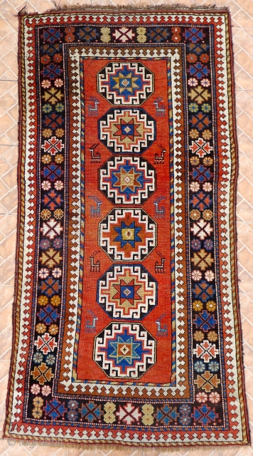 a nw Persian Kelardasht Rug, 3.5x 6.9ft. (108x210 cm.) Circa 1910. Woven by a small community of Karabagh Kurds who settled in the Manzanderan province around 1900. The design with Moghan medallions on a red field flanked by Arabian Oryx antilopes, presently nearly extinct in the wild. An unusual type of rug, more rare than its Moghan counter part.