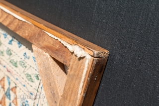a very fine antique XIXth Century Kantha. Silk and cotton. Frame-mounted over 75 years ago. Pristine condition without any damage or repair. 43 x 35 inches.