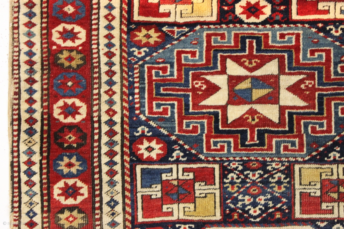 antique caucasian shirvan or moghan rug in an unusually small size. As found, overall mostly good even pile with a couple small areas of wear as shown. All natural colors. Original selvages with a few spots needing a little attention. Remnant end flat weave. Reasonably clean. Bold and cheerful rug, ca. 1875. Great size 3'1" x 6'6"