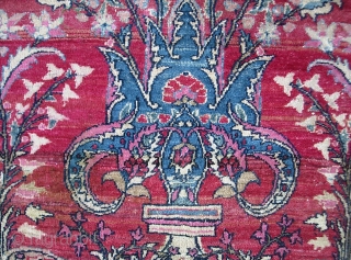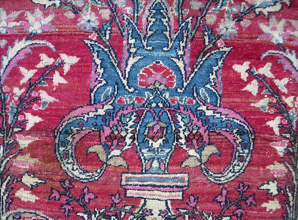 Old super-fine Pushti. 21 x 22 inches. Genuinely old Persian piece of uncertain about origin and i won't hazard a guess. Double wefted (one blue) on cotton foundation. Actual knot count is 19 x 27-- (437 kpsi). Little cutie. $20 ups to lower 48.