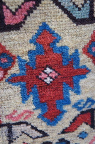 Kuba large section fragment dated 1230 ah (1816 ad), 40" x 38". This example uses a Hamadan border motif which i have never seen in any Caucasian rug before. The colors al all typical indigenous colors including a pale violet which seems to be routinely present in rugs of this age. The blood red dye in the small medallion forms have a corrosive component which leaves them slightly lower than surrounding colors. This is a piece obviously missing its bottom section; it has some splits, is missing sections of edge and apparently someone though it was worth fixing a very long time ago. These remnants remain attached to the upper right side. In general the fragment has almost full pile of the very best wool. Price include shipment any where in the lower 48 states. Checks preferred.