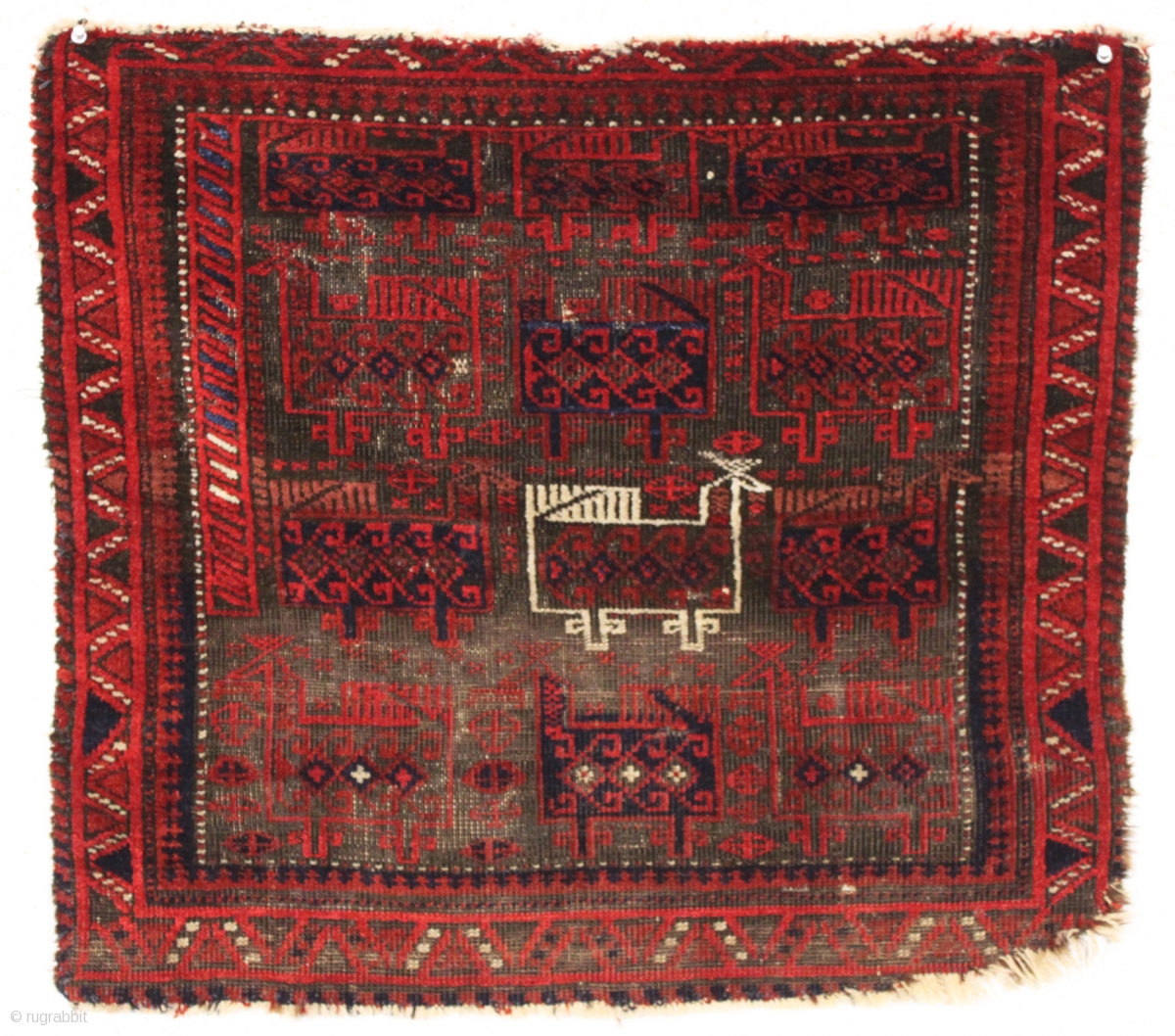 antique baluch bird bag. Lovely high quality little example with all natural colors featuring an outstanding ember red and a bit of electric blue highlightingh. Unusual border design and a quirky partial side border. Heavily oxidized brown ground. Edges as found. Few old moth nibbles. Clean with a soft floppy handle. One from my humble collection. Good age, ca. 1880 or earlier. 25" x 28"