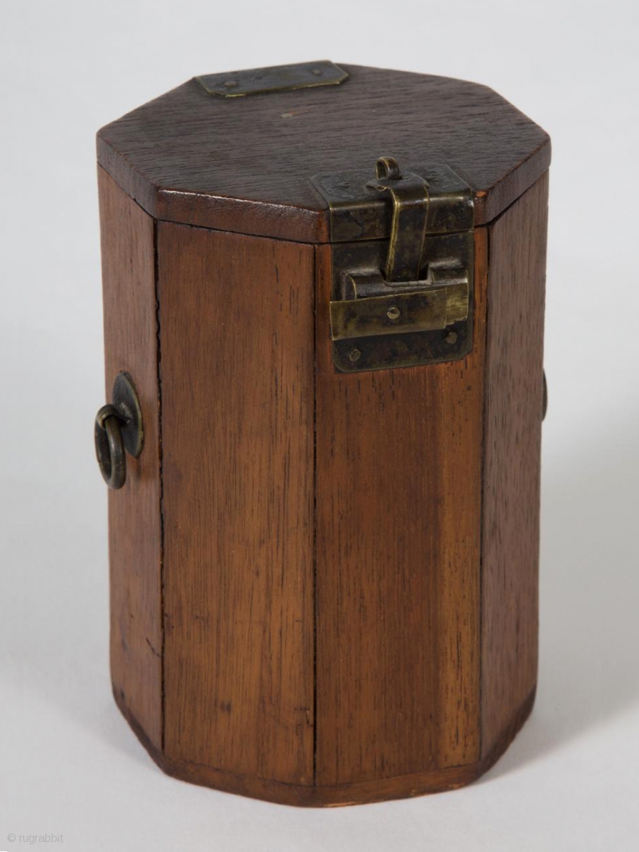 a small, unique octagonal box from Korea. 4.75" (12 cm) high by 3" (7.5 cm) wide. It opens by sliding the latch to the left, which releases the small hook. Brass hardware, remnants of paper lining inside. There are two seams that have hairline shrinkage, but the box is stable.