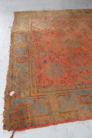 Very pretty Oushak carpet...the pile is not bad, but there are issues... 3.30m x 2.73m (10'11" x 9'). Been in my dusty corner too long...$1000 plus shipping.