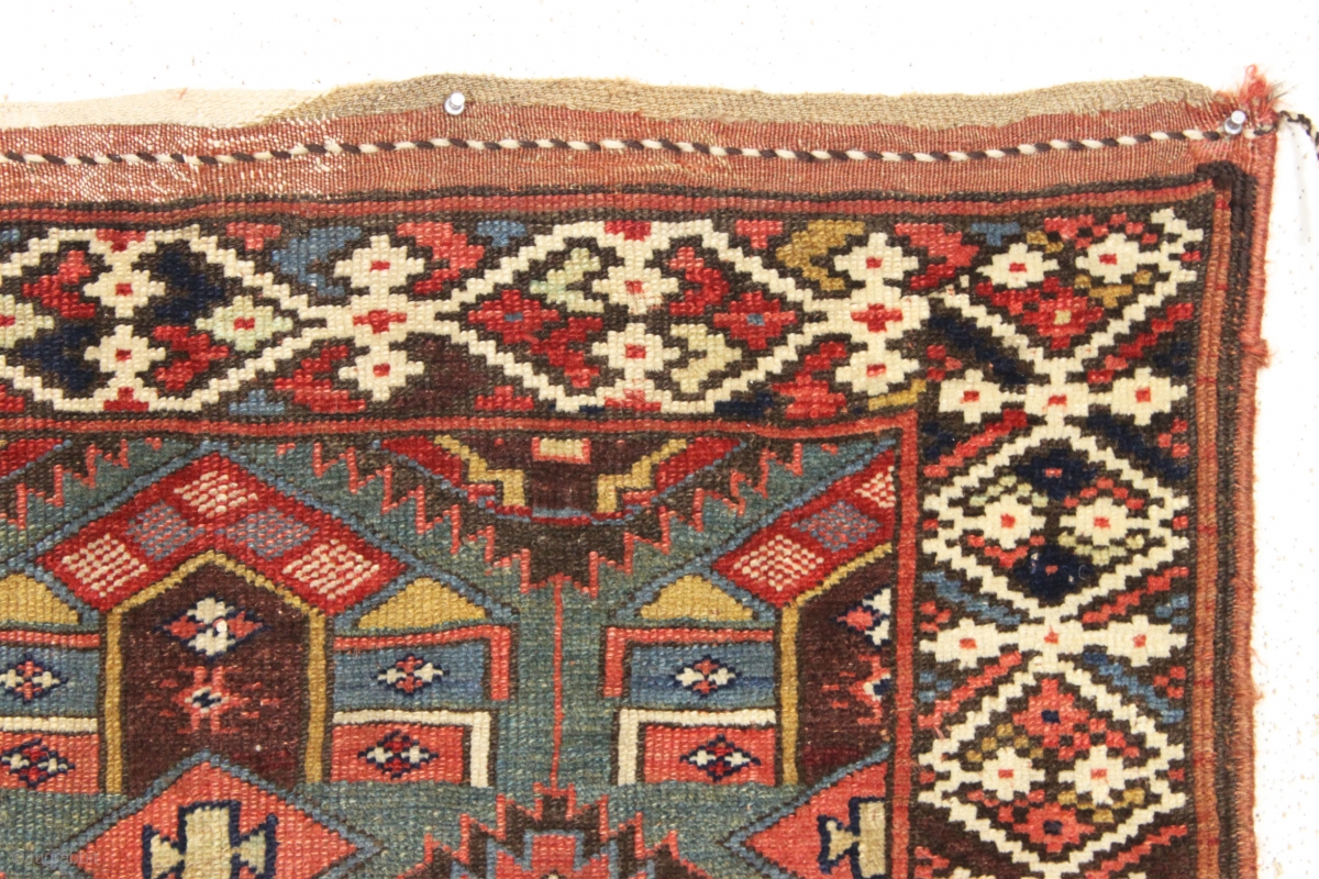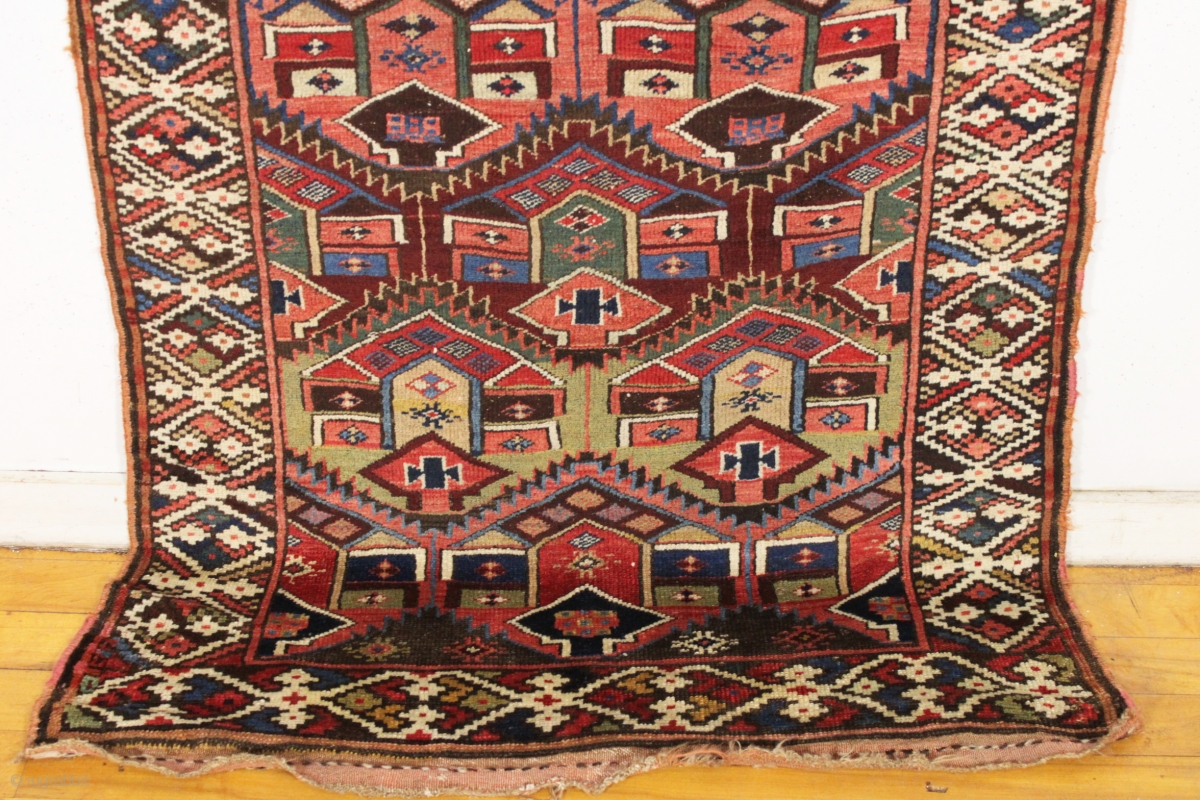 antique kurdish palmette long rug in excellent original condition with no repairs. Beautiful field design paired with an interesting border. All natural colors including some pretty camel wool pile. Washed, but otherwise as found with good even pile, original edges and no repairs. New England estate rug. Soft supple handle. Good age, ca. 1875 or earlier. 3'7" x 10'2"