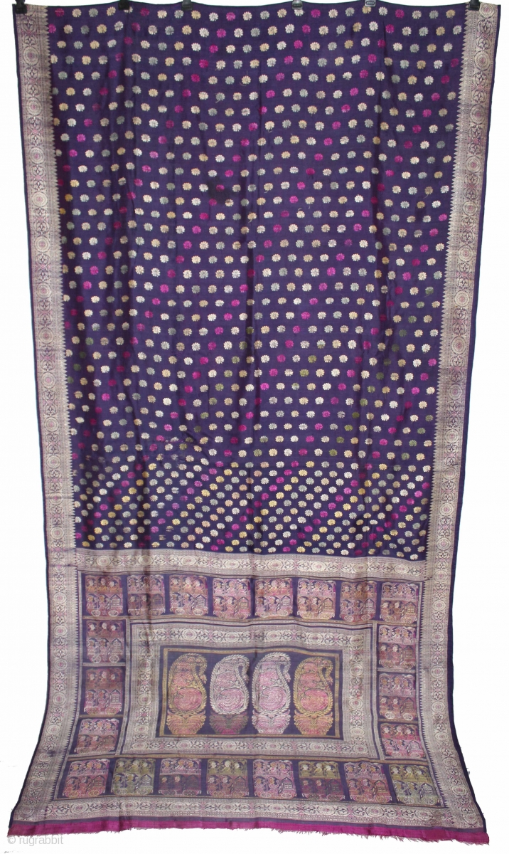 Pallav of a Baluchar Sari woven in silk Brocade From Murshidabad,West Bengal,India.The motifs of butta cones and Figures of Europeans travelling in railway carriages.British administrators were instrumental in reviving the industry there in the Late 19th century.The pallav is in the mint condition , only the inner part is original repaired.(DSE01920).